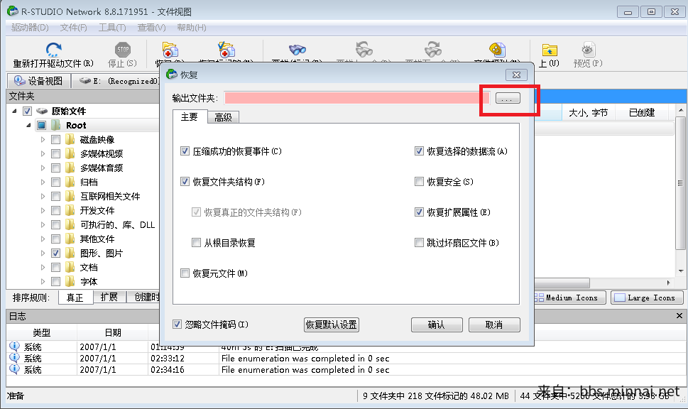 六、选择您要恢复出来数据的导出路径(注意:数据不要直接选择导回原本要恢复的那个盘符里,以免造成数据覆盖、数据损坏),无需更改其他参数,点击【确认】即可。